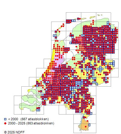 Het aantal atlasblokken (5x5 km) waarin de soort is gemeld binnen een periode van vijf jaar (vanaf 1980) of twintig jaar. Niet gecorrigeerd voor waarnemersinspanning en het aantal doorgegeven waarnemingen kan sterk variƫren per periode, dus een trend in verspreiding kan hier niet direct uit worden afgelezen. Het opgegeven jaartal is het eerste jaar van de periode. Bron: gevalideerde waarnemingen uit de NDFF.