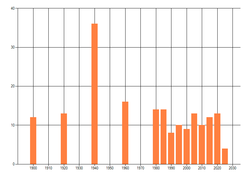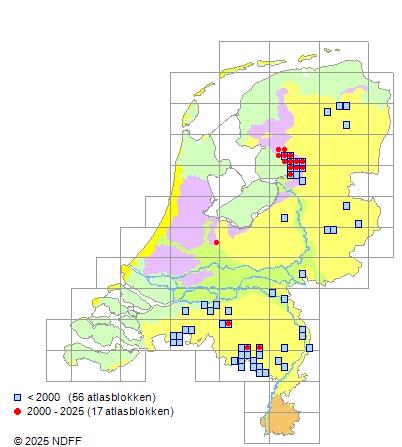 Het aantal atlasblokken (5x5 km) waarin de soort is gemeld binnen een periode van vijf jaar (vanaf 1980) of twintig jaar. Niet gecorrigeerd voor waarnemersinspanning en het aantal doorgegeven waarnemingen kan sterk variëren per periode, dus een trend in verspreiding kan hier niet direct uit worden afgelezen. Het opgegeven jaartal is het eerste jaar van de periode. Bron: gevalideerde waarnemingen uit de NDFF.