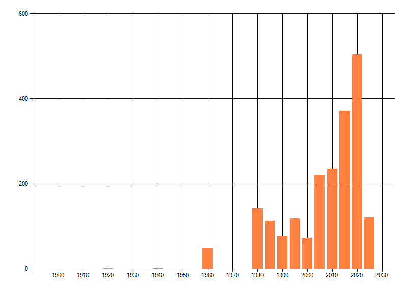 Het aantal atlasblokken (5x5 km) waarin de soort is gemeld binnen een periode van vijf jaar (vanaf 1980) of twintig jaar. Niet gecorrigeerd voor waarnemersinspanning en het aantal doorgegeven waarnemingen kan sterk variëren per periode, dus een trend in verspreiding kan hier niet direct uit worden afgelezen. Het opgegeven jaartal is het eerste jaar van de periode. Bron: gevalideerde waarnemingen uit de NDFF.