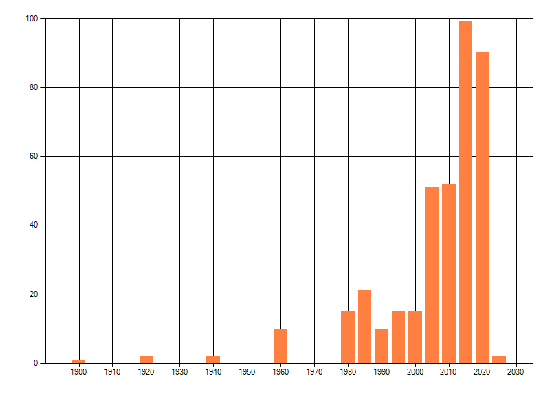 Het aantal atlasblokken (5x5 km) waarin de soort is gemeld binnen een periode van vijf jaar (vanaf 1980) of twintig jaar. Niet gecorrigeerd voor waarnemersinspanning en het aantal doorgegeven waarnemingen kan sterk variëren per periode, dus een trend in verspreiding kan hier niet direct uit worden afgelezen. Het opgegeven jaartal is het eerste jaar van de periode. Bron: gevalideerde waarnemingen uit de NDFF.