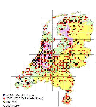 Het aantal atlasblokken (5x5 km) waarin de soort is gemeld binnen een periode van vijf jaar (vanaf 1980) of twintig jaar. Niet gecorrigeerd voor waarnemersinspanning en het aantal doorgegeven waarnemingen kan sterk variëren per periode, dus een trend in verspreiding kan hier niet direct uit worden afgelezen. Het opgegeven jaartal is het eerste jaar van de periode. Bron: gevalideerde waarnemingen uit de NDFF.