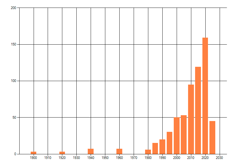 Het aantal atlasblokken (5x5 km) waarin de soort is gemeld binnen een periode van vijf jaar (vanaf 1980) of twintig jaar. Niet gecorrigeerd voor waarnemersinspanning en het aantal doorgegeven waarnemingen kan sterk variëren per periode, dus een trend in verspreiding kan hier niet direct uit worden afgelezen. Het opgegeven jaartal is het eerste jaar van de periode. Bron: gevalideerde waarnemingen uit de NDFF.