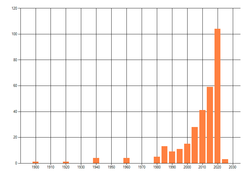 Het aantal atlasblokken (5x5 km) waarin de soort is gemeld binnen een periode van vijf jaar (vanaf 1980) of twintig jaar. Niet gecorrigeerd voor waarnemersinspanning en het aantal doorgegeven waarnemingen kan sterk variëren per periode, dus een trend in verspreiding kan hier niet direct uit worden afgelezen. Het opgegeven jaartal is het eerste jaar van de periode. Bron: gevalideerde waarnemingen uit de NDFF.