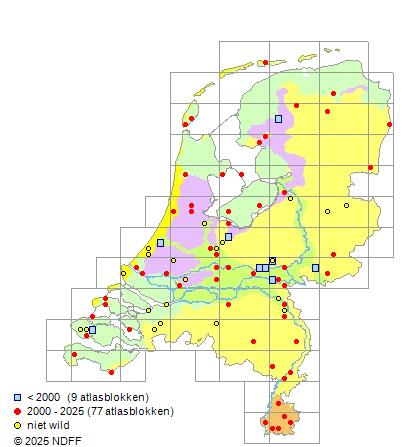 Het aantal atlasblokken (5x5 km) waarin de soort is gemeld binnen een periode van vijf jaar (vanaf 1980) of twintig jaar. Niet gecorrigeerd voor waarnemersinspanning en het aantal doorgegeven waarnemingen kan sterk variëren per periode, dus een trend in verspreiding kan hier niet direct uit worden afgelezen. Het opgegeven jaartal is het eerste jaar van de periode. Bron: gevalideerde waarnemingen uit de NDFF.
