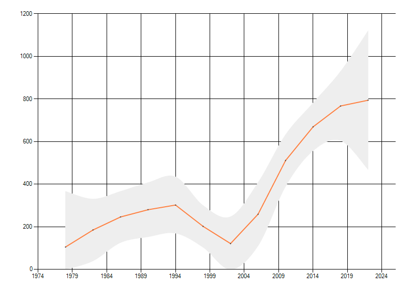 Gemiddelde trend van het aantal kilometerhokken waarin de soort voorkomt, weergegeven als indexcijfer (1975-1978 = 100). De trend is gecorrigeerd voor waarnemersinspanning en geeft de relatieve verandering in het aantal bezette kilometerhokken weer. Voor de berekening worden de data per periode van vier jaar samengenomen. In de grafiek correspondeert ieder punt met het laatste jaar van zo'n periode.
