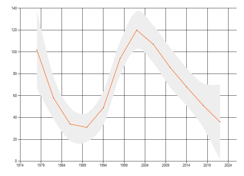 Gemiddelde trend van het aantal kilometerhokken waarin de soort voorkomt, weergegeven als indexcijfer (1975-1978 = 100). De trend is gecorrigeerd voor waarnemersinspanning en geeft de relatieve verandering in het aantal bezette kilometerhokken weer. Voor de berekening worden de data per periode van vier jaar samengenomen. In de grafiek correspondeert ieder punt met het laatste jaar van zo'n periode.
