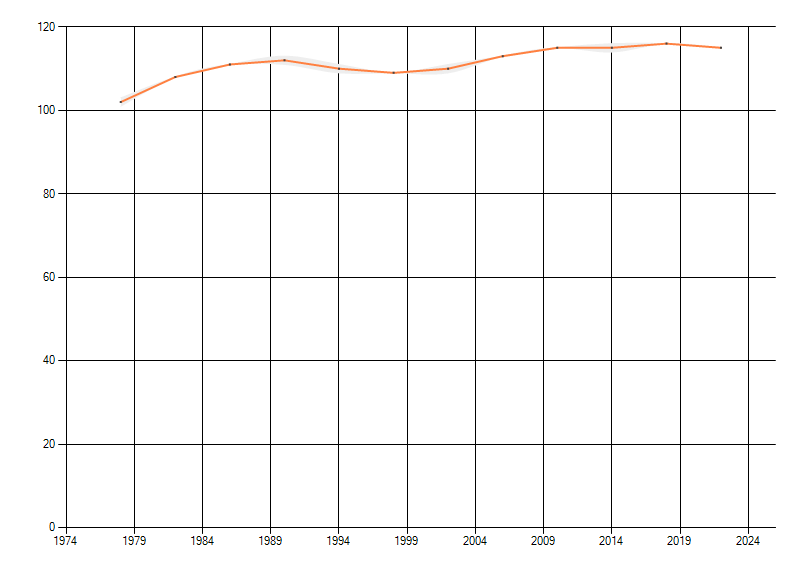 Gemiddelde trend van het aantal kilometerhokken waarin de soort voorkomt, weergegeven als indexcijfer (1975-1978 = 100). De trend is gecorrigeerd voor waarnemersinspanning en geeft de relatieve verandering in het aantal bezette kilometerhokken weer. Voor de berekening worden de data per periode van vier jaar samengenomen. In de grafiek correspondeert ieder punt met het laatste jaar van zo'n periode.