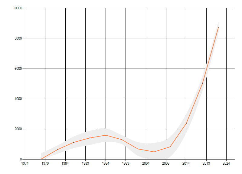 Gemiddelde trend van het aantal kilometerhokken waarin de soort voorkomt, weergegeven als indexcijfer (1975-1978 = 100). De trend is gecorrigeerd voor waarnemersinspanning en geeft de relatieve verandering in het aantal bezette kilometerhokken weer. Voor de berekening worden de data per periode van vier jaar samengenomen. In de grafiek correspondeert ieder punt met het laatste jaar van zo'n periode.