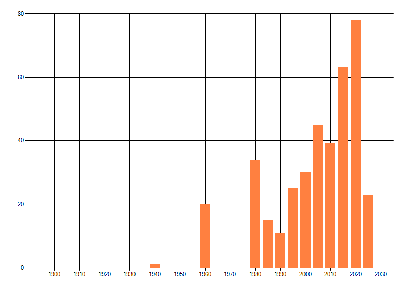 Het aantal atlasblokken (5x5 km) waarin de soort is gemeld binnen een periode van vijf jaar (vanaf 1980) of twintig jaar. Niet gecorrigeerd voor waarnemersinspanning en het aantal doorgegeven waarnemingen kan sterk variëren per periode, dus een trend in verspreiding kan hier niet direct uit worden afgelezen. Het opgegeven jaartal is het eerste jaar van de periode. Bron: gevalideerde waarnemingen uit de NDFF.