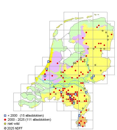 Het aantal atlasblokken (5x5 km) waarin de soort is gemeld binnen een periode van vijf jaar (vanaf 1980) of twintig jaar. Niet gecorrigeerd voor waarnemersinspanning en het aantal doorgegeven waarnemingen kan sterk variëren per periode, dus een trend in verspreiding kan hier niet direct uit worden afgelezen. Het opgegeven jaartal is het eerste jaar van de periode. Bron: gevalideerde waarnemingen uit de NDFF.