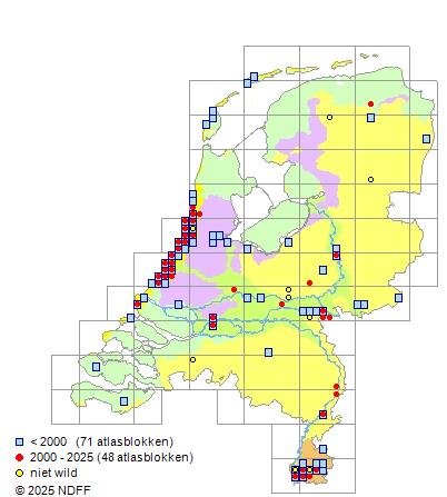 Het aantal atlasblokken (5x5 km) waarin de soort is gemeld binnen een periode van vijf jaar (vanaf 1980) of twintig jaar. Niet gecorrigeerd voor waarnemersinspanning en het aantal doorgegeven waarnemingen kan sterk variëren per periode, dus een trend in verspreiding kan hier niet direct uit worden afgelezen. Het opgegeven jaartal is het eerste jaar van de periode. Bron: gevalideerde waarnemingen uit de NDFF.