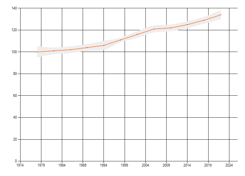 Gemiddelde trend van het aantal kilometerhokken waarin de soort voorkomt, weergegeven als indexcijfer (1975-1978 = 100). De trend is gecorrigeerd voor waarnemersinspanning en geeft de relatieve verandering in het aantal bezette kilometerhokken weer. Voor de berekening worden de data per periode van vier jaar samengenomen. In de grafiek correspondeert ieder punt met het laatste jaar van zo'n periode.