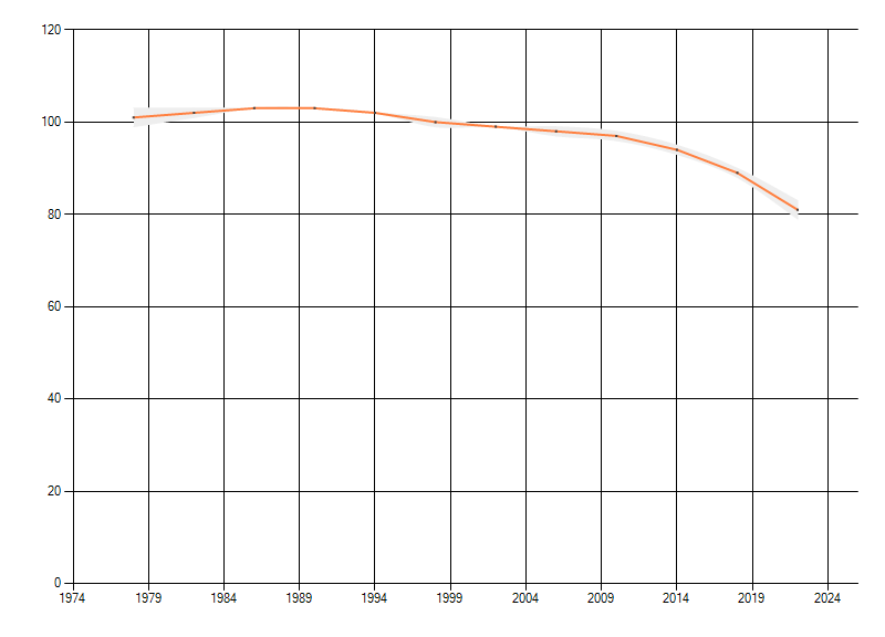 Gemiddelde trend van het aantal kilometerhokken waarin de soort voorkomt, weergegeven als indexcijfer (1975-1978 = 100).