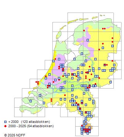 Het aantal atlasblokken (5x5 km) waarin de soort is gemeld binnen een periode van vijf jaar (vanaf 1980) of twintig jaar. Niet gecorrigeerd voor waarnemersinspanning en het aantal doorgegeven waarnemingen kan sterk variëren per periode, dus een trend in verspreiding kan hier niet direct uit worden afgelezen. Het opgegeven jaartal is het eerste jaar van de periode. Bron: gevalideerde waarnemingen uit de NDFF.