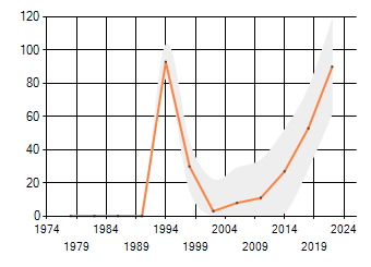 Gemiddelde trend van het aantal kilometerhokken waarin de soort voorkomt, weergegeven als indexcijfer (1975-1978 = 100). De trend is gecorrigeerd voor waarnemersinspanning en geeft de relatieve verandering in het aantal bezette kilometerhokken weer. Voor de berekening worden de data per periode van vier jaar samengenomen. In de grafiek correspondeert ieder punt met het laatste jaar van zo'n periode.