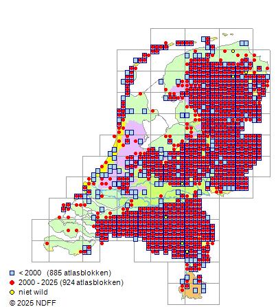 CC BY-NC-SA 3.0 NLVerspreidingNederlandVrij algemeen in het oosten en midden van het land en op de Waddeneilanden en zeldzaam in laagveengebieden. Elders zeer zeldzaam.