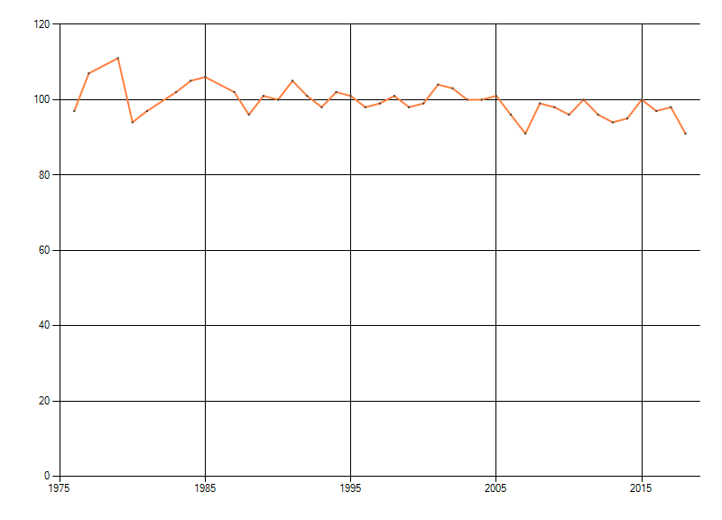 Gemiddelde trend van het aantal kilometerhokken waarin de soort voorkomt, weergegeven als indexcijfer (1975-1978 = 100). De trend is gecorrigeerd voor waarnemersinspanning en geeft de relatieve verandering in het aantal bezette kilometerhokken weer. Voor de berekening worden de data per periode van vier jaar samengenomen. In de grafiek correspondeert ieder punt met het laatste jaar van zo'n periode.