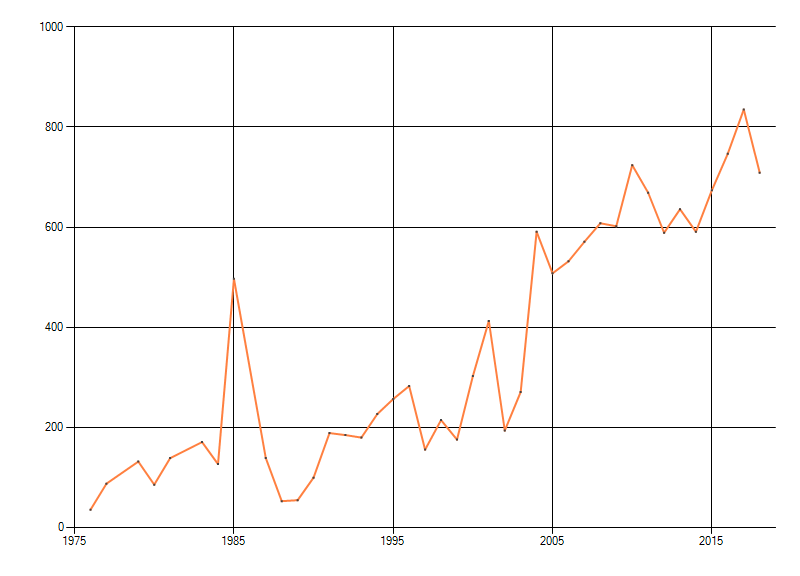 Gemiddelde trend van het aantal kilometerhokken waarin de soort voorkomt, weergegeven als indexcijfer (1975-1978 = 100). De trend is gecorrigeerd voor waarnemersinspanning en geeft de relatieve verandering in het aantal bezette kilometerhokken weer. Voor de berekening worden de data per periode van vier jaar samengenomen. In de grafiek correspondeert ieder punt met het laatste jaar van zo'n periode.