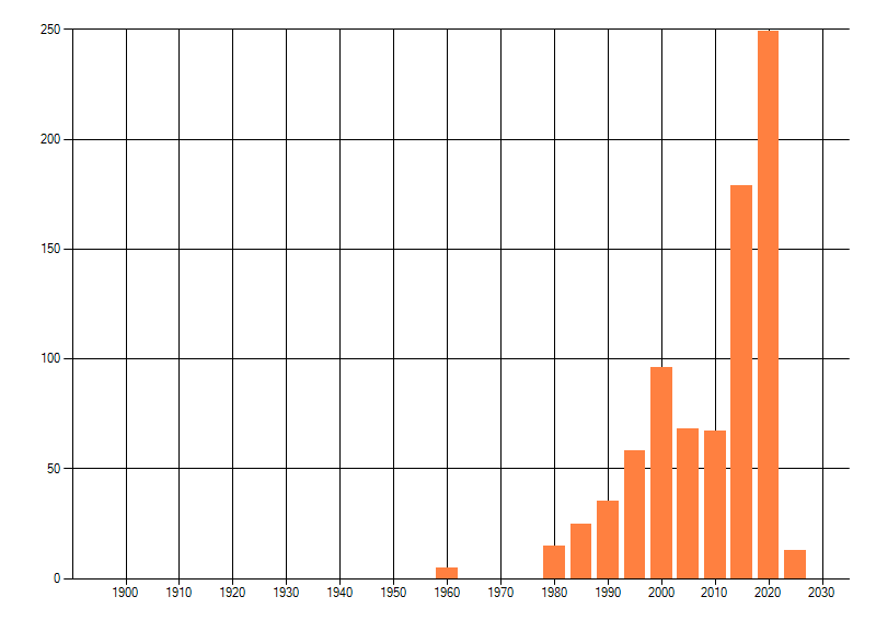 Het aantal atlasblokken (5x5 km) waarin de soort is gemeld binnen een periode van vijf jaar (vanaf 1980) of twintig jaar. Niet gecorrigeerd voor waarnemersinspanning en het aantal doorgegeven waarnemingen kan sterk variëren per periode, dus een trend in verspreiding kan hier niet direct uit worden afgelezen. Het opgegeven jaartal is het eerste jaar van de periode. Bron: gevalideerde waarnemingen uit de NDFF.