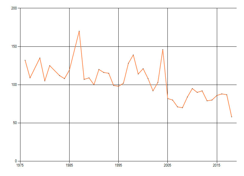 Gemiddelde trend van het aantal kilometerhokken waarin de soort voorkomt, weergegeven als indexcijfer (1975-1978 = 100). De trend is gecorrigeerd voor waarnemersinspanning en geeft de relatieve verandering in het aantal bezette kilometerhokken weer. Voor de berekening worden de data per periode van vier jaar samengenomen. In de grafiek correspondeert ieder punt met het laatste jaar van zo'n periode.