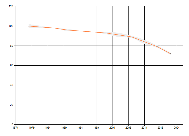 Gemiddelde trend van het aantal kilometerhokken waarin de soort voorkomt, weergegeven als indexcijfer (1975-1978 = 100).