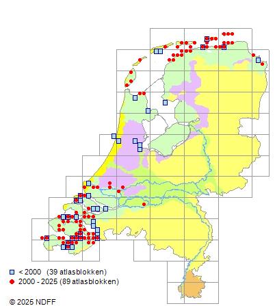 Het aantal atlasblokken (5x5 km) waarin de soort is gemeld binnen een periode van vijf jaar (vanaf 1980) of twintig jaar. Niet gecorrigeerd voor waarnemersinspanning en het aantal doorgegeven waarnemingen kan sterk variëren per periode, dus een trend in verspreiding kan hier niet direct uit worden afgelezen. Het opgegeven jaartal is het eerste jaar van de periode. Bron: gevalideerde waarnemingen uit de NDFF.