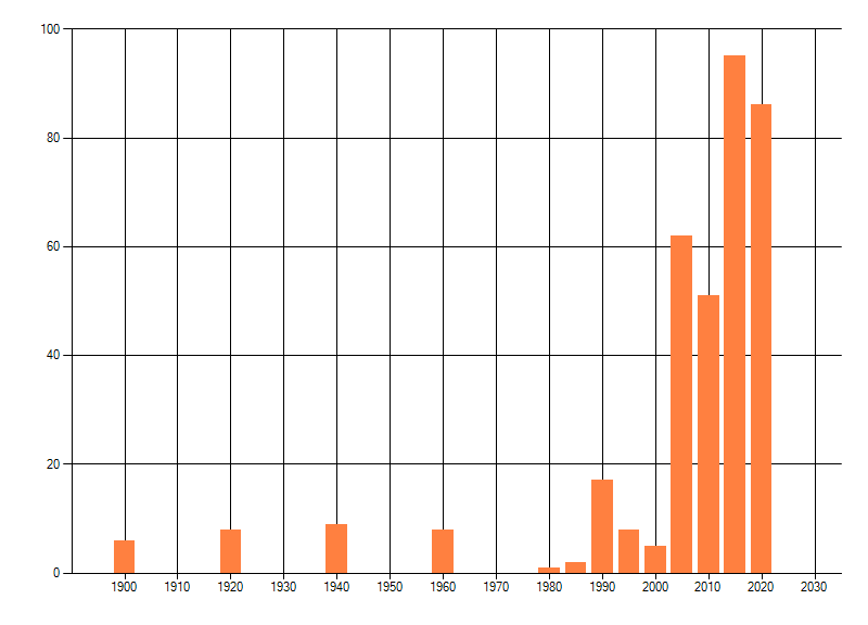 Het aantal atlasblokken (5x5 km) waarin de soort is gemeld binnen een periode van vijf jaar (vanaf 1980) of twintig jaar. Niet gecorrigeerd voor waarnemersinspanning en het aantal doorgegeven waarnemingen kan sterk variëren per periode, dus een trend in verspreiding kan hier niet direct uit worden afgelezen. Het opgegeven jaartal is het eerste jaar van de periode. Bron: gevalideerde waarnemingen uit de NDFF.