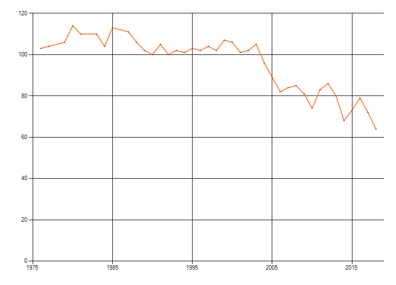 Gemiddelde trend van het aantal kilometerhokken waarin de soort voorkomt, weergegeven als indexcijfer (1975-1978 = 100). De trend is gecorrigeerd voor waarnemersinspanning en geeft de relatieve verandering in het aantal bezette kilometerhokken weer. Voor de berekening worden de data per periode van vier jaar samengenomen. In de grafiek correspondeert ieder punt met het laatste jaar van zo'n periode.