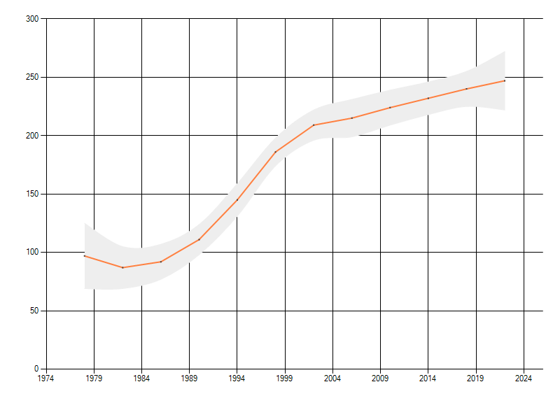 Gemiddelde trend van het aantal kilometerhokken waarin de soort voorkomt, weergegeven als indexcijfer (1975-1978 = 100).