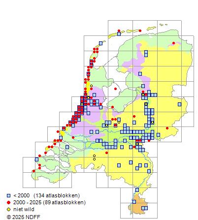 Het aantal atlasblokken (5x5 km) waarin de soort is gemeld binnen een periode van vijf jaar (vanaf 1980) of twintig jaar. Niet gecorrigeerd voor waarnemersinspanning en het aantal doorgegeven waarnemingen kan sterk variëren per periode, dus een trend in verspreiding kan hier niet direct uit worden afgelezen. Het opgegeven jaartal is het eerste jaar van de periode. Bron: gevalideerde waarnemingen uit de NDFF.