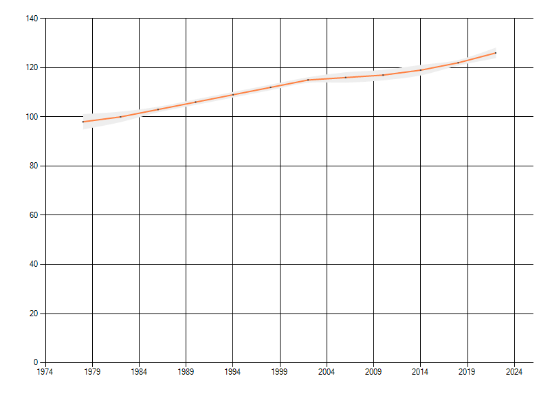 Gemiddelde trend van het aantal kilometerhokken waarin de soort voorkomt, weergegeven als indexcijfer (1975-1978 = 100). De trend is gecorrigeerd voor waarnemersinspanning en geeft de relatieve verandering in het aantal bezette kilometerhokken weer. Voor de berekening worden de data per periode van vier jaar samengenomen. In de grafiek correspondeert ieder punt met het laatste jaar van zo'n periode.