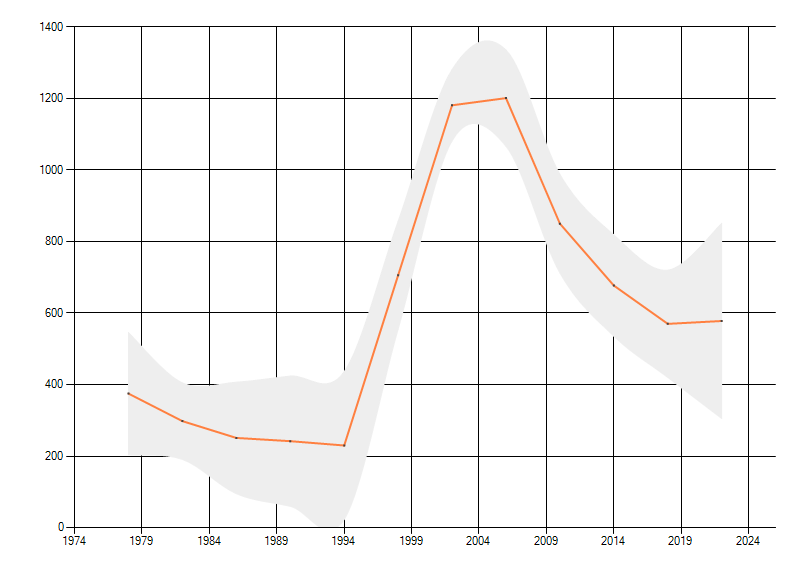 Gemiddelde trend van het aantal kilometerhokken waarin de soort voorkomt, weergegeven als indexcijfer (1975-1978 = 100). De trend is gecorrigeerd voor waarnemersinspanning en geeft de relatieve verandering in het aantal bezette kilometerhokken weer. Voor de berekening worden de data per periode van vier jaar samengenomen. In de grafiek correspondeert ieder punt met het laatste jaar van zo'n periode.
