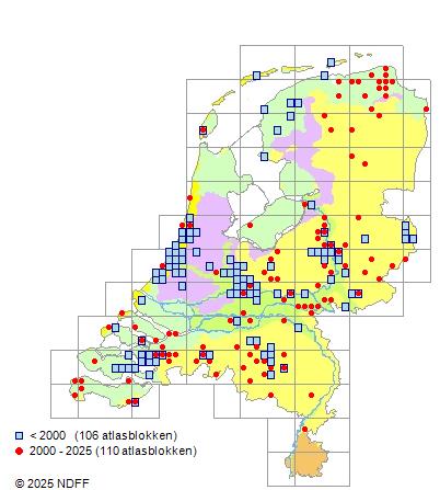 Het aantal atlasblokken (5x5 km) waarin de soort is gemeld binnen een periode van vijf jaar (vanaf 1980) of twintig jaar.