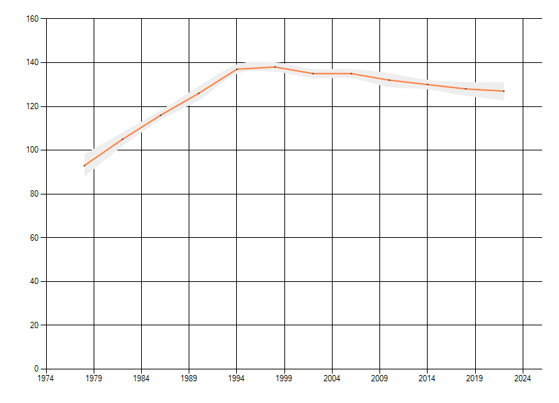 Gemiddelde trend van het aantal kilometerhokken waarin de soort voorkomt, weergegeven als indexcijfer (1975-1978 = 100).