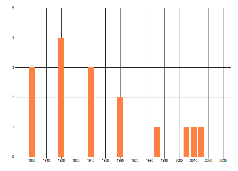 Het aantal atlasblokken (5x5 km) waarin de soort is gemeld binnen een periode van vijf jaar (vanaf 1980) of twintig jaar. Niet gecorrigeerd voor waarnemersinspanning en het aantal doorgegeven waarnemingen kan sterk variëren per periode, dus een trend in verspreiding kan hier niet direct uit worden afgelezen. Het opgegeven jaartal is het eerste jaar van de periode. Bron: gevalideerde waarnemingen uit de NDFF.