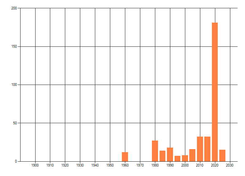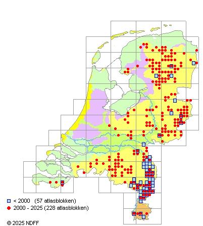 Het aantal atlasblokken (5x5 km) waarin de soort is gemeld binnen een periode van vijf jaar (vanaf 1980) of twintig jaar. Niet gecorrigeerd voor waarnemersinspanning en het aantal doorgegeven waarnemingen kan sterk variëren per periode, dus een trend in verspreiding kan hier niet direct uit worden afgelezen. Het opgegeven jaartal is het eerste jaar van de periode. Bron: gevalideerde waarnemingen uit de NDFF.
