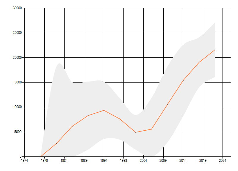Gemiddelde trend van het aantal kilometerhokken waarin de soort voorkomt, weergegeven als indexcijfer (1975-1978 = 100). De trend is gecorrigeerd voor waarnemersinspanning en geeft de relatieve verandering in het aantal bezette kilometerhokken weer. Voor de berekening worden de data per periode van vier jaar samengenomen. In de grafiek correspondeert ieder punt met het laatste jaar van zo'n periode.