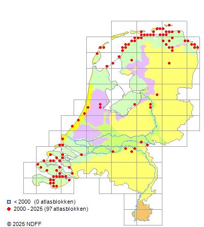 Het aantal atlasblokken (5x5 km) waarin de soort is gemeld binnen een periode van vijf jaar (vanaf 1980) of twintig jaar. Niet gecorrigeerd voor waarnemersinspanning en het aantal doorgegeven waarnemingen kan sterk variëren per periode, dus een trend in verspreiding kan hier niet direct uit worden afgelezen. Het opgegeven jaartal is het eerste jaar van de periode. Bron: gevalideerde waarnemingen uit de NDFF.