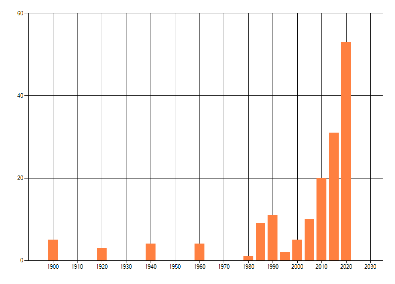 Het aantal atlasblokken (5x5 km) waarin de soort is gemeld binnen een periode van vijf jaar (vanaf 1980) of twintig jaar. Niet gecorrigeerd voor waarnemersinspanning en het aantal doorgegeven waarnemingen kan sterk variëren per periode, dus een trend in verspreiding kan hier niet direct uit worden afgelezen. Het opgegeven jaartal is het eerste jaar van de periode. Bron: gevalideerde waarnemingen uit de NDFF.