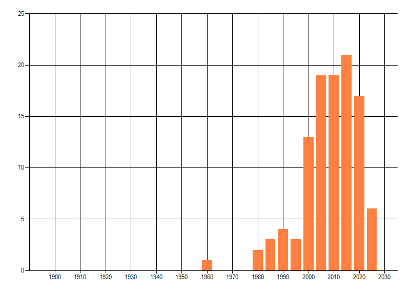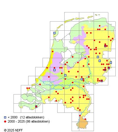 Het aantal atlasblokken (5x5 km) waarin de soort is gemeld binnen een periode van vijf jaar (vanaf 1980) of twintig jaar. Niet gecorrigeerd voor waarnemersinspanning en het aantal doorgegeven waarnemingen kan sterk variëren per periode, dus een trend in verspreiding kan hier niet direct uit worden afgelezen. Het opgegeven jaartal is het eerste jaar van de periode. Bron: gevalideerde waarnemingen uit de NDFF.