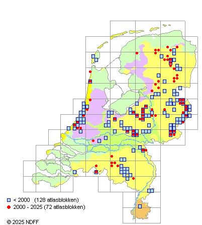 Het aantal atlasblokken (5x5 km) waarin de soort is gemeld binnen een periode van vijf jaar (vanaf 1980) of twintig jaar. Niet gecorrigeerd voor waarnemersinspanning en het aantal doorgegeven waarnemingen kan sterk variëren per periode, dus een trend in verspreiding kan hier niet direct uit worden afgelezen. Het opgegeven jaartal is het eerste jaar van de periode. Bron: gevalideerde waarnemingen uit de NDFF.