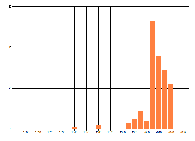 Het aantal atlasblokken (5x5 km) waarin de soort is gemeld binnen een periode van vijf jaar (vanaf 1980) of twintig jaar. Niet gecorrigeerd voor waarnemersinspanning en het aantal doorgegeven waarnemingen kan sterk variëren per periode, dus een trend in verspreiding kan hier niet direct uit worden afgelezen. Het opgegeven jaartal is het eerste jaar van de periode. Bron: gevalideerde waarnemingen uit de NDFF.