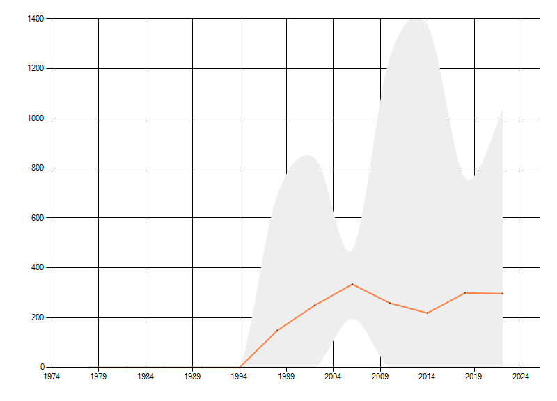 Gemiddelde trend van het aantal kilometerhokken waarin de soort voorkomt, weergegeven als indexcijfer (1975-1978 = 100). De trend is gecorrigeerd voor waarnemersinspanning en geeft de relatieve verandering in het aantal bezette kilometerhokken weer. Voor de berekening worden de data per periode van vier jaar samengenomen. In de grafiek correspondeert ieder punt met het laatste jaar van zo'n periode.