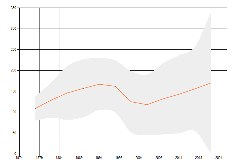 Gemiddelde trend van het aantal kilometerhokken waarin de soort voorkomt, weergegeven als indexcijfer (1975-1978 = 100). De trend is gecorrigeerd voor waarnemersinspanning en geeft de relatieve verandering in het aantal bezette kilometerhokken weer. Voor de berekening worden de data per periode van vier jaar samengenomen. In de grafiek correspondeert ieder punt met het laatste jaar van zo'n periode.