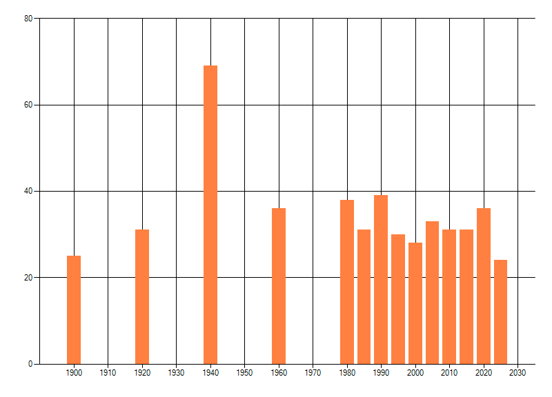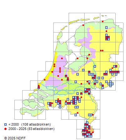 Het aantal atlasblokken (5x5 km) waarin de soort is gemeld binnen een periode van vijf jaar (vanaf 1980) of twintig jaar. Niet gecorrigeerd voor waarnemersinspanning en het aantal doorgegeven waarnemingen kan sterk variëren per periode, dus een trend in verspreiding kan hier niet direct uit worden afgelezen. Het opgegeven jaartal is het eerste jaar van de periode. Bron: gevalideerde waarnemingen uit de NDFF.