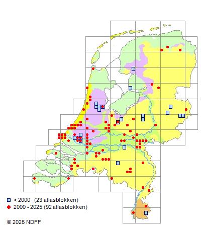 CC BY-NC-SA 3.0 NLVerspreidingNederlandZeldzaam ingeburgerd, met name in stedelijke gebieden. Ingeburgerd tussen 1975 en 1999.