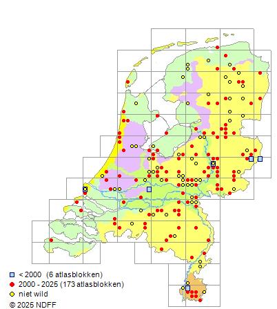 Het aantal atlasblokken (5x5 km) waarin de soort is gemeld binnen een periode van vijf jaar (vanaf 1980) of twintig jaar. Niet gecorrigeerd voor waarnemersinspanning en het aantal doorgegeven waarnemingen kan sterk variëren per periode, dus een trend in verspreiding kan hier niet direct uit worden afgelezen. Het opgegeven jaartal is het eerste jaar van de periode. Bron: gevalideerde waarnemingen uit de NDFF.