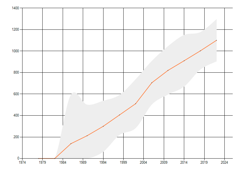 Gemiddelde trend van het aantal kilometerhokken waarin de soort voorkomt, weergegeven als indexcijfer (1975-1978 = 100). De trend is gecorrigeerd voor waarnemersinspanning en geeft de relatieve verandering in het aantal bezette kilometerhokken weer. Voor de berekening worden de data per periode van vier jaar samengenomen. In de grafiek correspondeert ieder punt met het laatste jaar van zo'n periode.