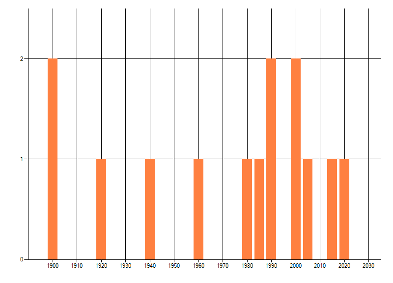 Het aantal atlasblokken (5x5 km) waarin de soort is gemeld binnen een periode van vijf jaar (vanaf 1980) of twintig jaar. Niet gecorrigeerd voor waarnemersinspanning en het aantal doorgegeven waarnemingen kan sterk variëren per periode, dus een trend in verspreiding kan hier niet direct uit worden afgelezen. Het opgegeven jaartal is het eerste jaar van de periode. Bron: gevalideerde waarnemingen uit de NDFF.