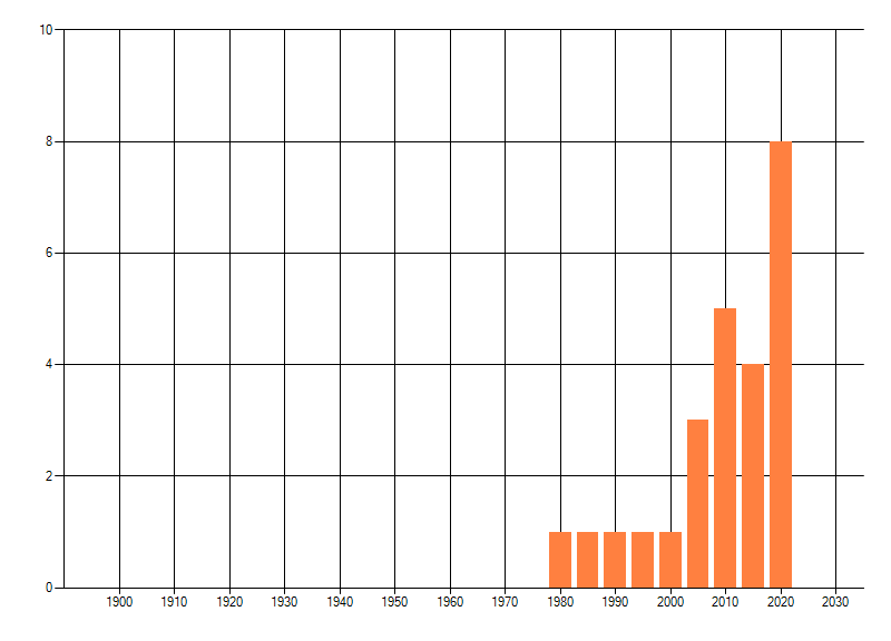 Het aantal atlasblokken (5x5 km) waarin de soort is gemeld binnen een periode van vijf jaar (vanaf 1980) of twintig jaar. Niet gecorrigeerd voor waarnemersinspanning en het aantal doorgegeven waarnemingen kan sterk variëren per periode, dus een trend in verspreiding kan hier niet direct uit worden afgelezen. Het opgegeven jaartal is het eerste jaar van de periode. Bron: gevalideerde waarnemingen uit de NDFF.